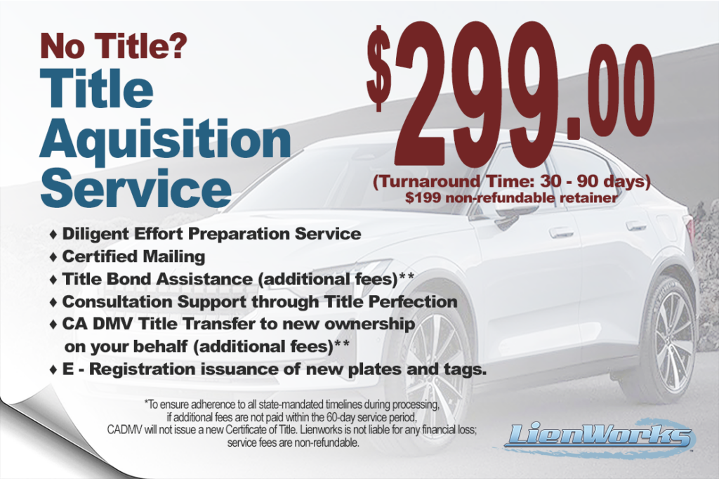 As a licensed California DMV Business Partner, we proudly offer The Title Acquisition Service—a specialized solution using the official California DMV Diligent Effort process to help vehicle owners and private party buyers obtain a new California title when the original title is lost, missing, or unavailable.